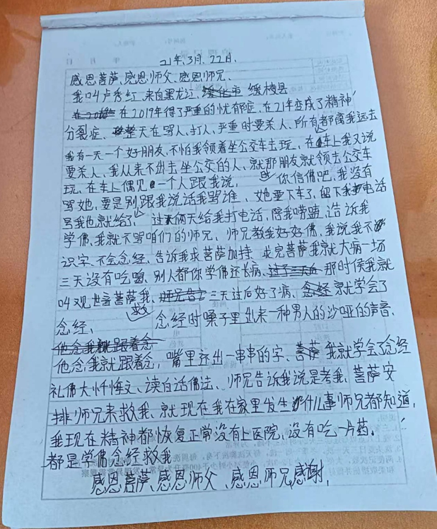 2024年3月,我去找工作上班儿,一个月能挣三千多元。自从学佛念经后,我没有吃一片儿药。从一个人见人怕,见人就骂,就想杀人的精神分裂症脱胎换骨变成一个吃斋念佛,一心向善的佛子了。